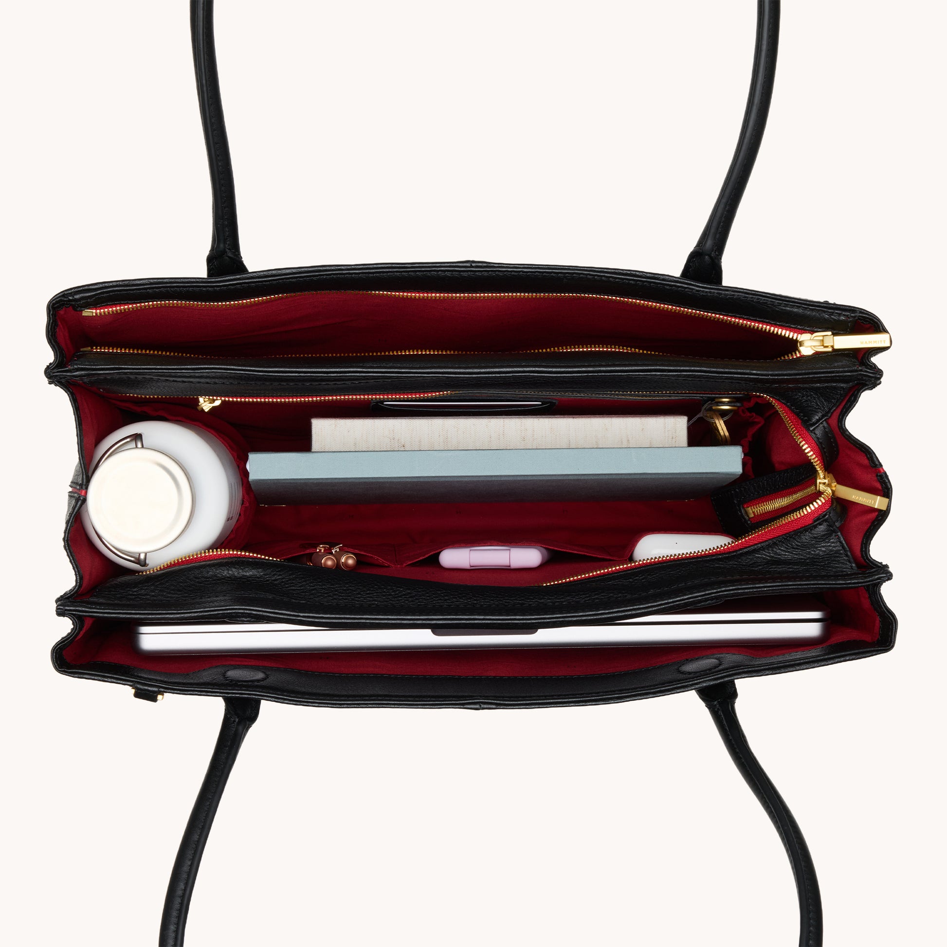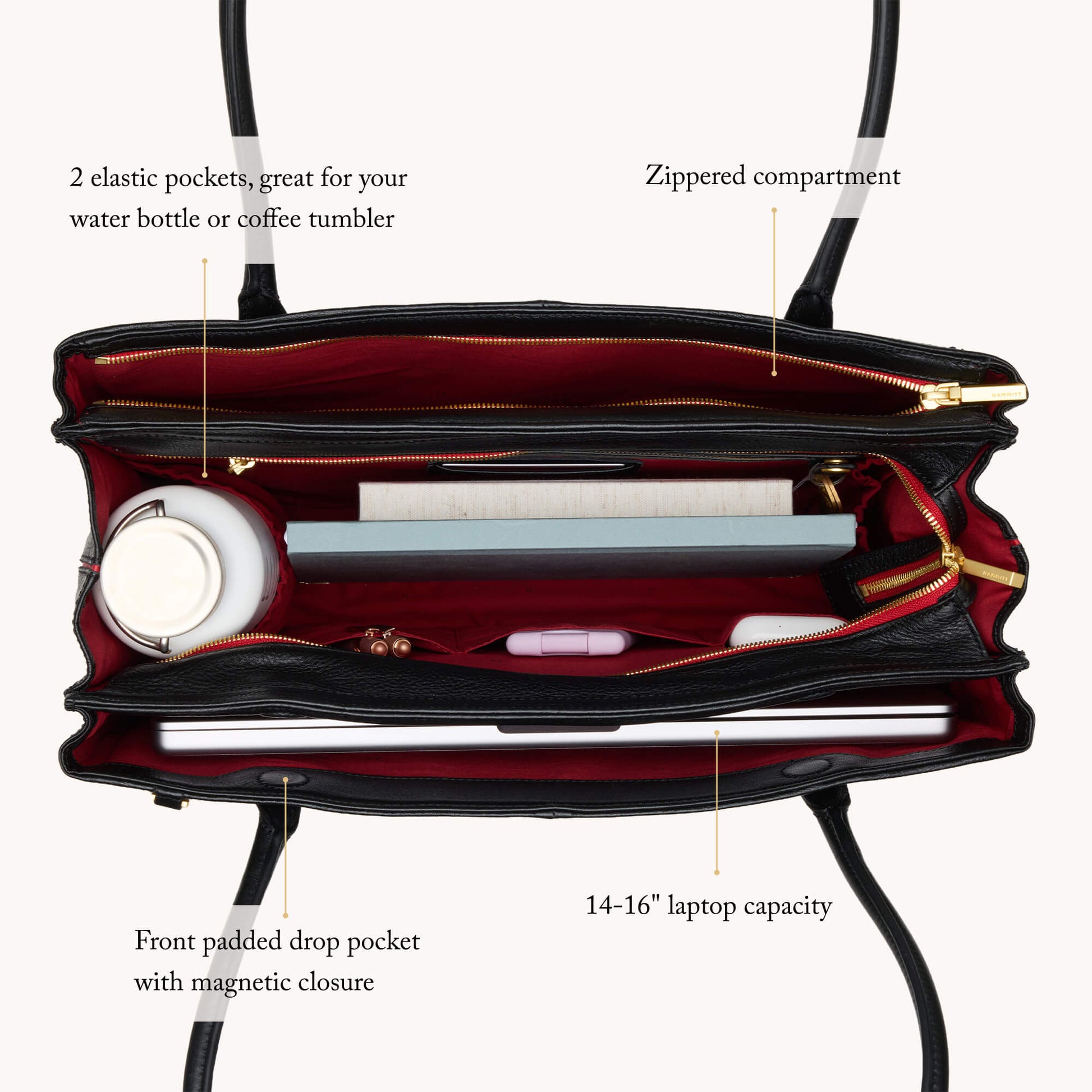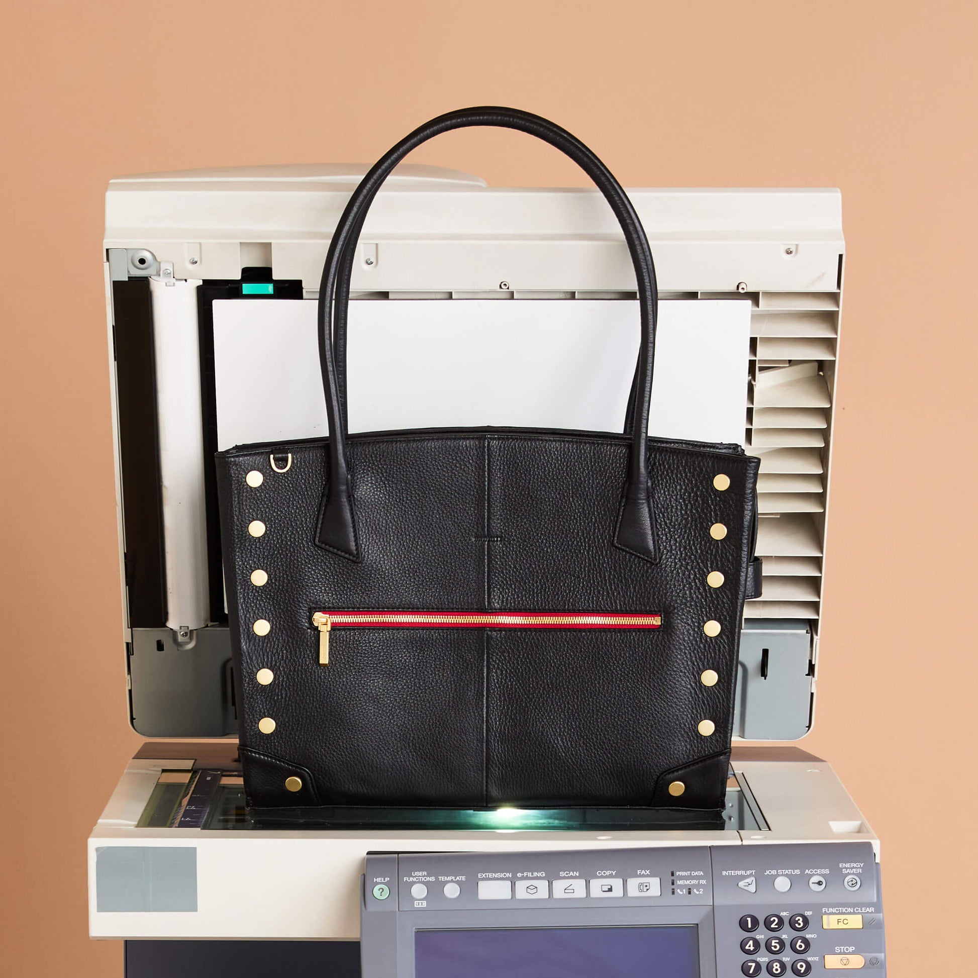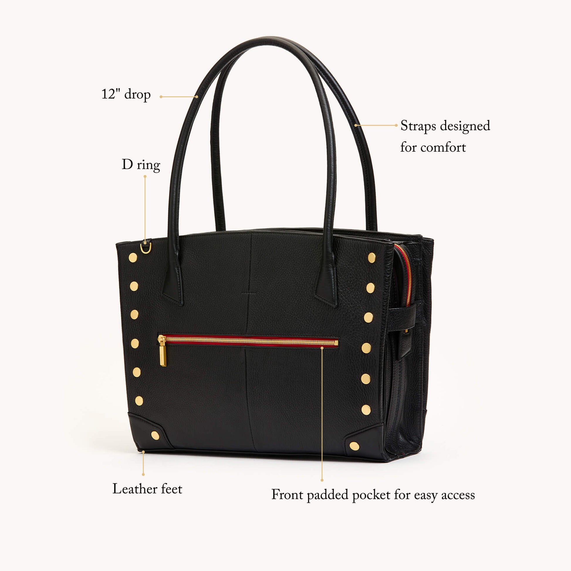 Named after infamous Elle Woods, Elle is our fully loaded work tote with maximum organization and stylish detailing. This drop shoulder tote is the perfect bag to stay looking sharp from your everyday commute to first impressions. Elle is the first truly work and laptop focused bag design for Hammitt - each wall is a padded tech compartment, and better yet, Elle remains upright on a surface even with a heavy laptop inside. No spilled bags here!