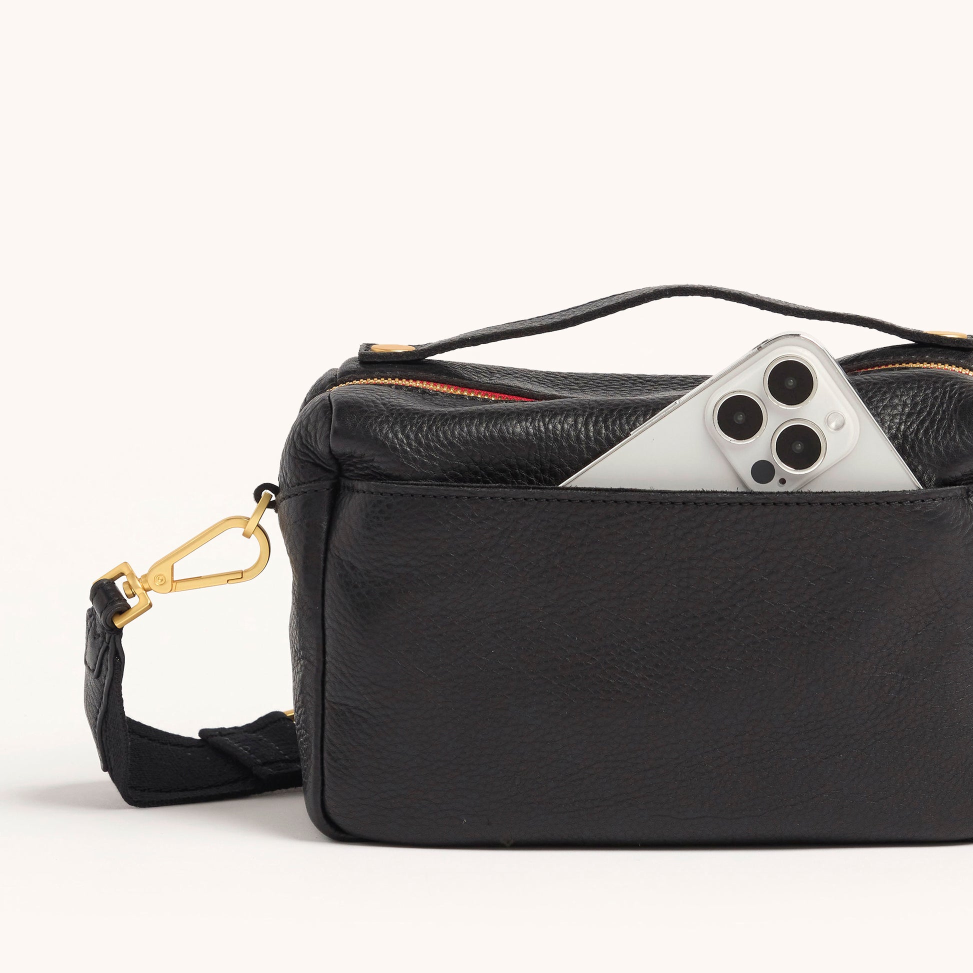 Specifically designed for customers who prefer a compact crossbody with a relaxed look, the Evan can be worn over the shoulder with our crossbody strap or can be carried by its top handle. Inspired by camera bags, with an east-west look. Embrace utilitarian styling with this fresh take on cargo detailing. Crafted from timeless black pebbled leather, this design features sleek 3D pouch pockets. Now enhanced with our signature brushed gold hardware and bold red zipper pairing, this special drop celebrates two of our signature pillars: Function and style.