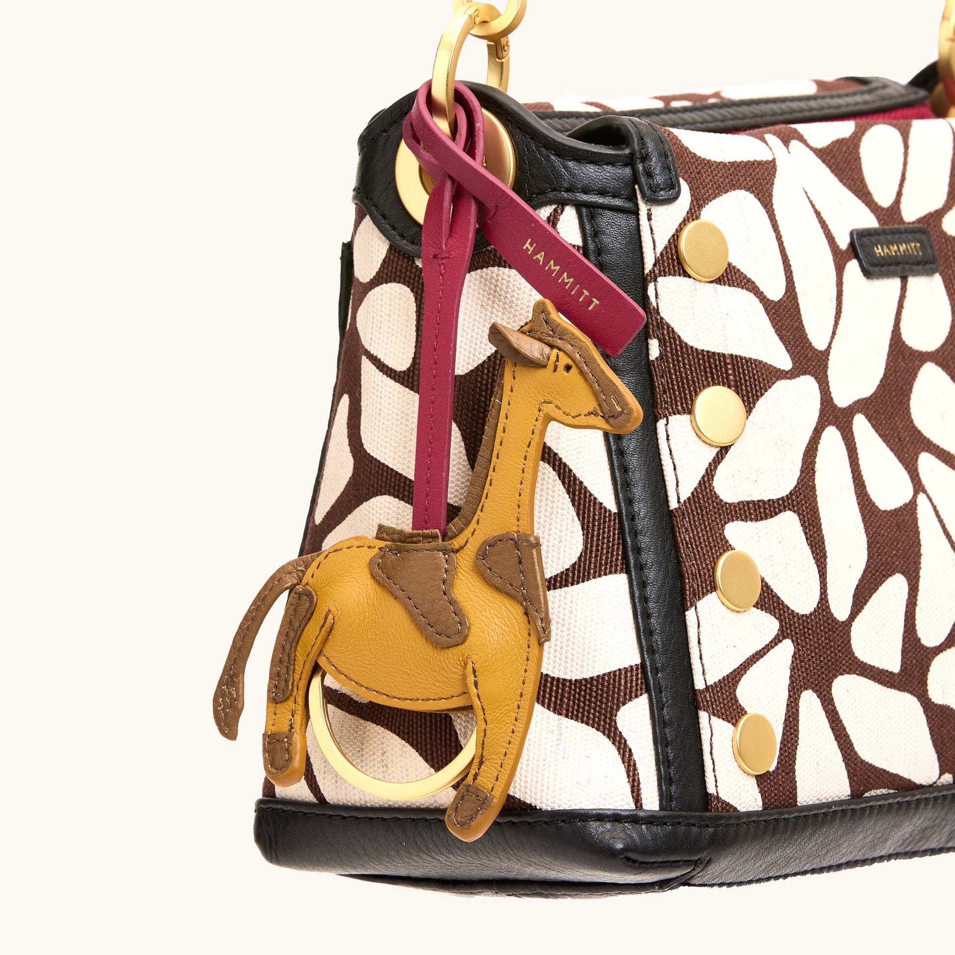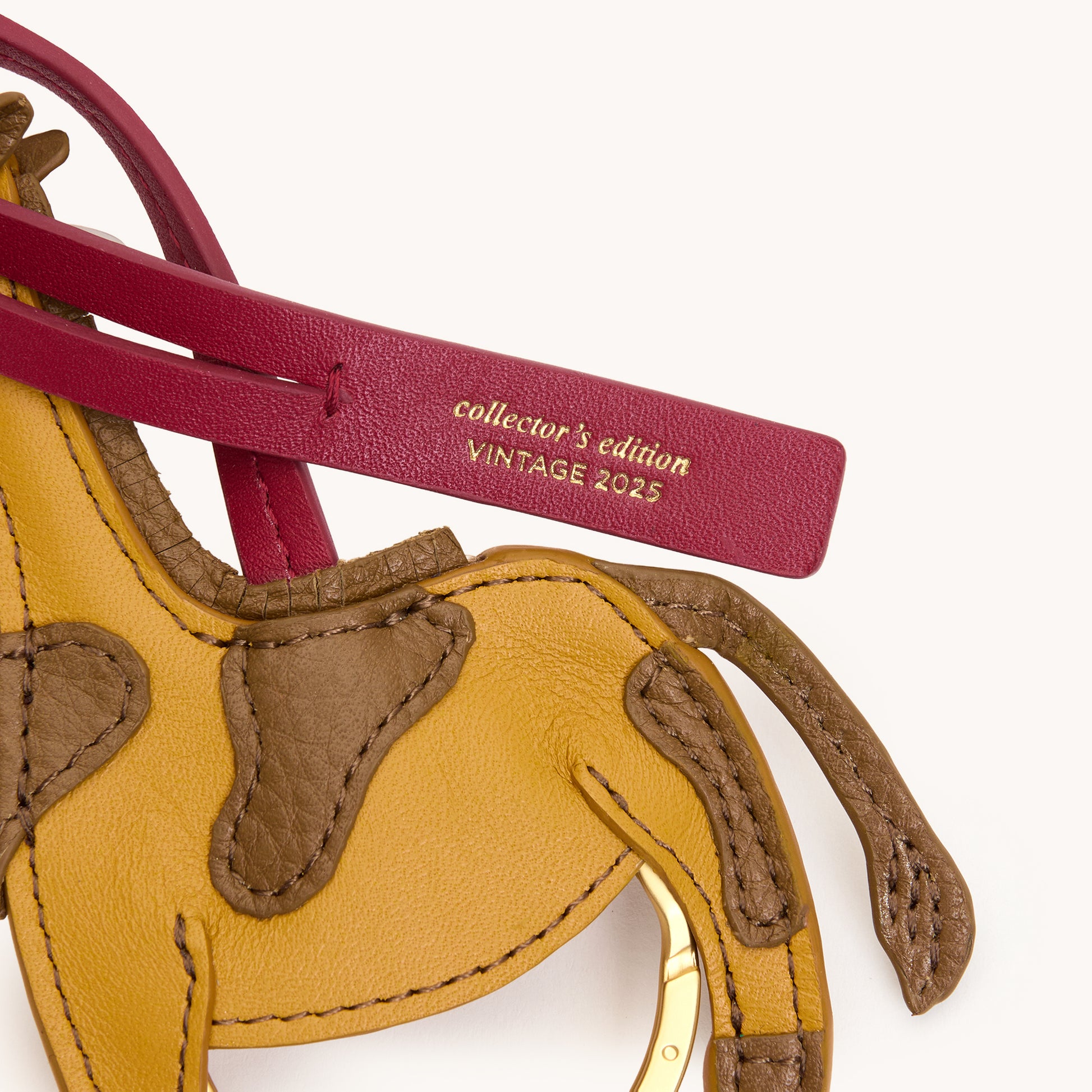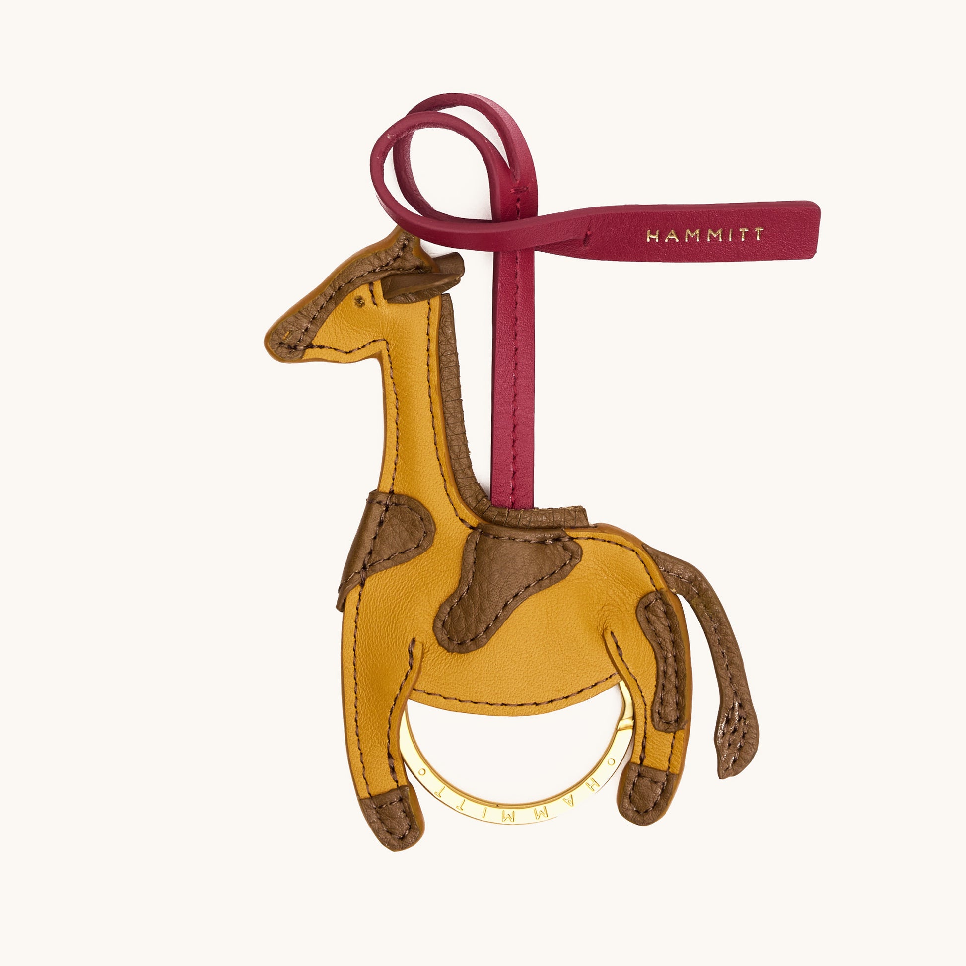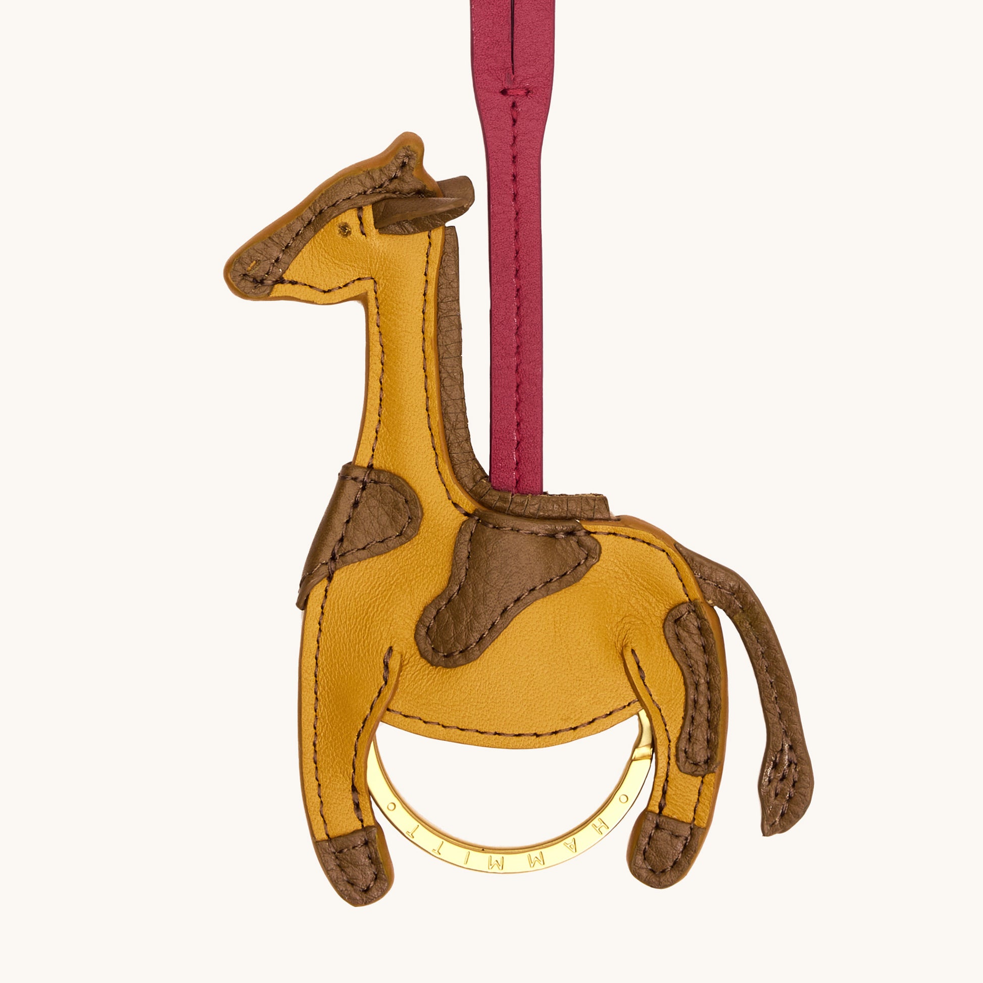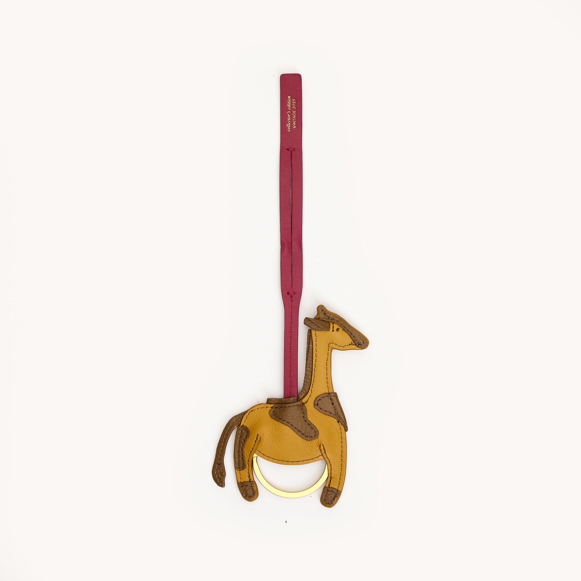 - Giraffe shaped keyring cover with fringe details, leather patches, and color blocking
