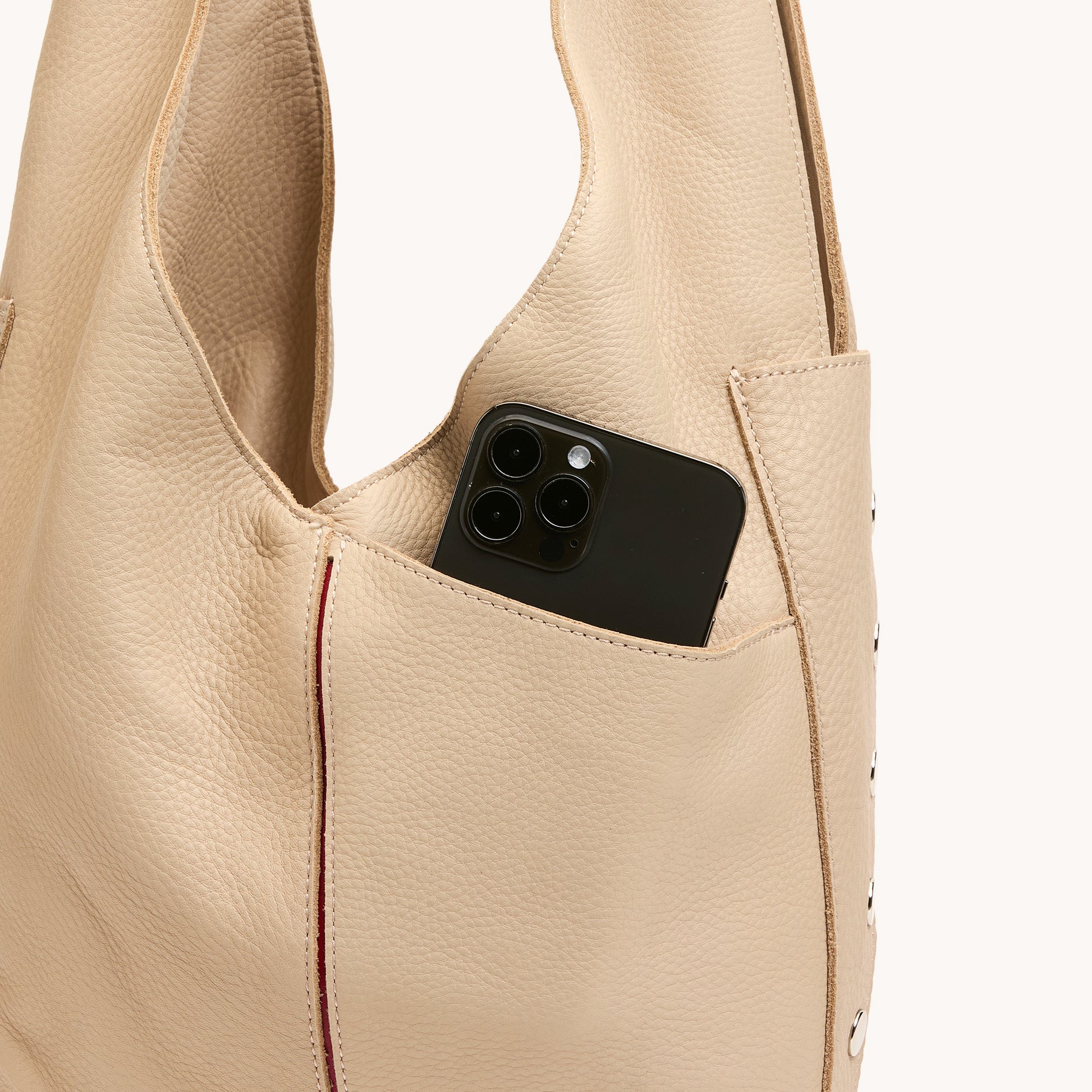 • Crafted with a warm cream pebble leather with beige and taupe undertones