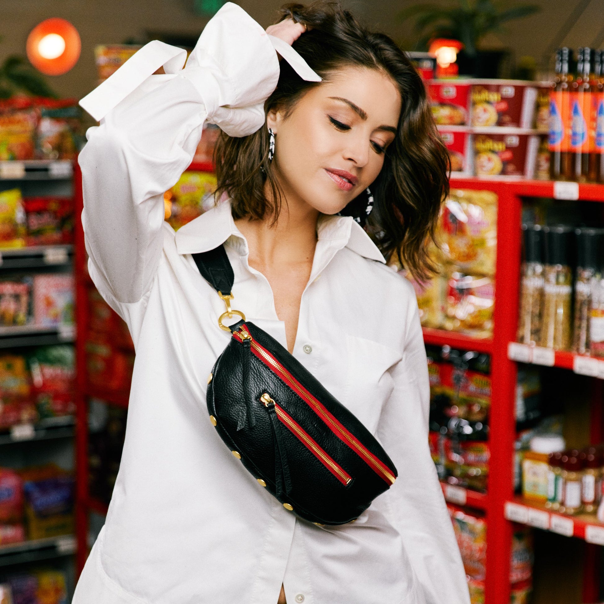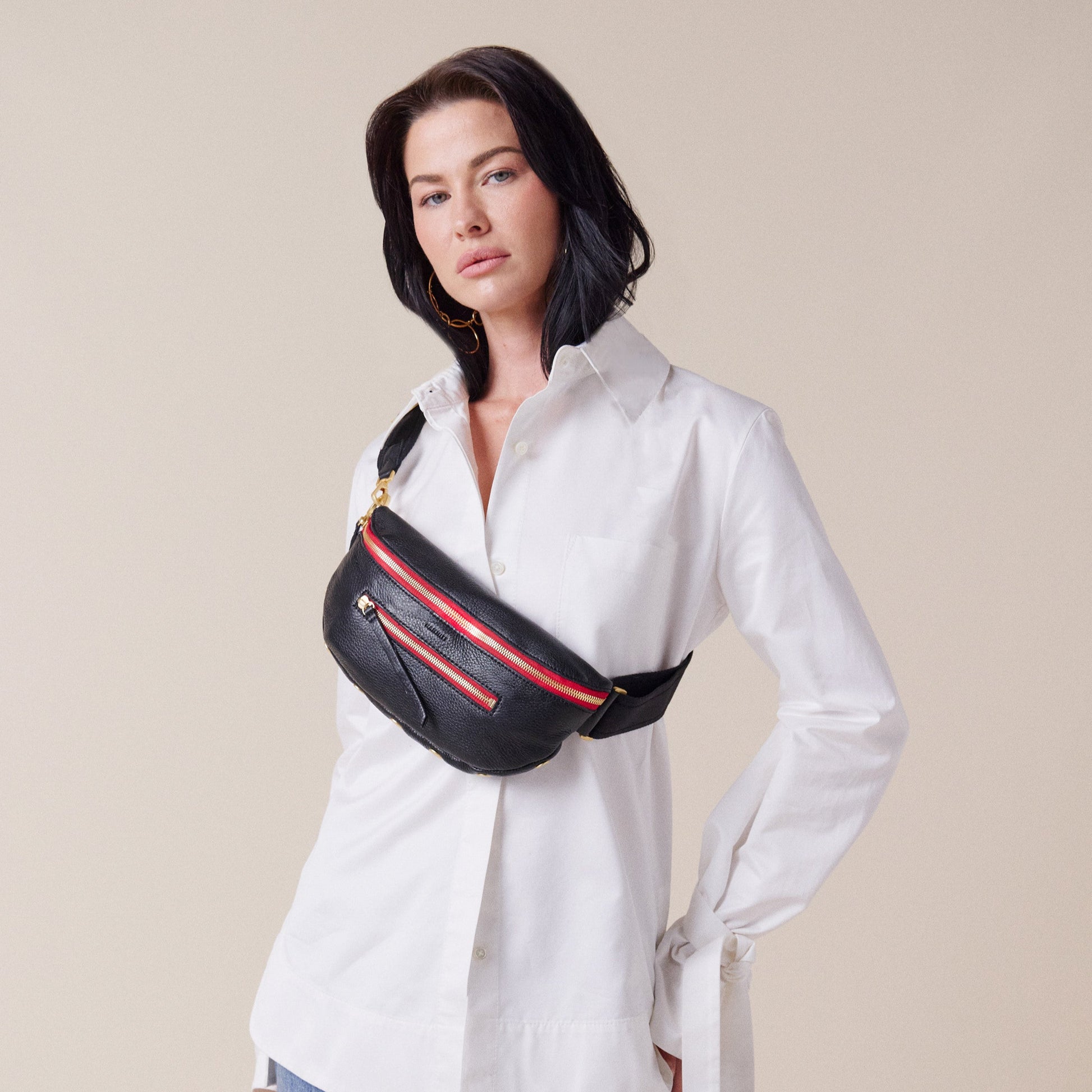 This updated take on our internet-famous belt bag embraces the crossbody styling our fans have come to love, with a longer strap for more looks. Its long strap allows you to truly wear this style as a low-slung crossbody, in addition to over your chest. Crafted with classic black pebbled leather. Our favorite update to the belt bag / fanny pack look, this crossbody bag can be worn as a sling so you can go hands-free. The strap can be double looped for an belt bag style around your waist as well!