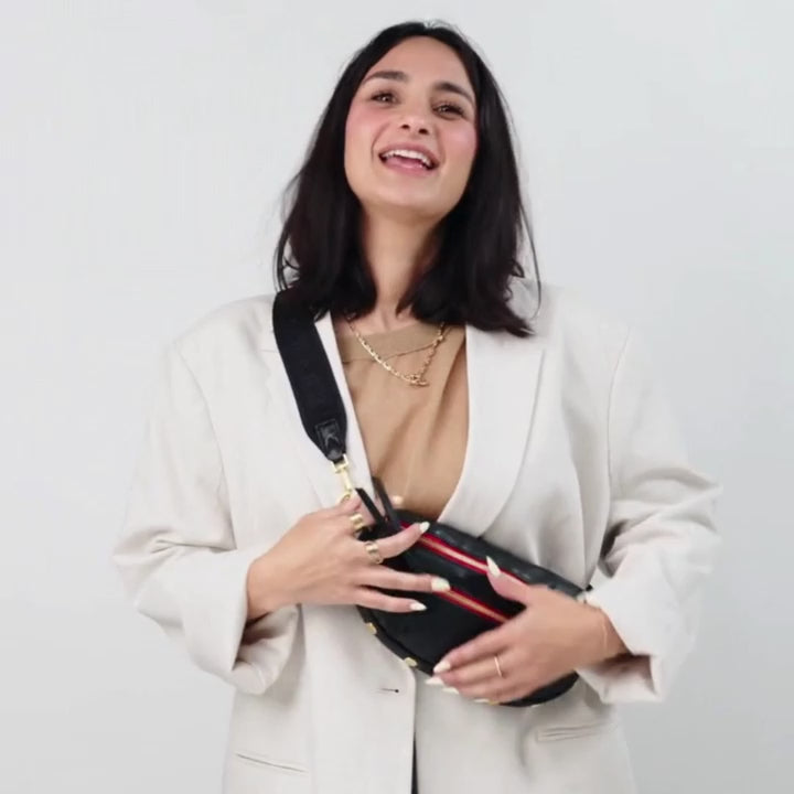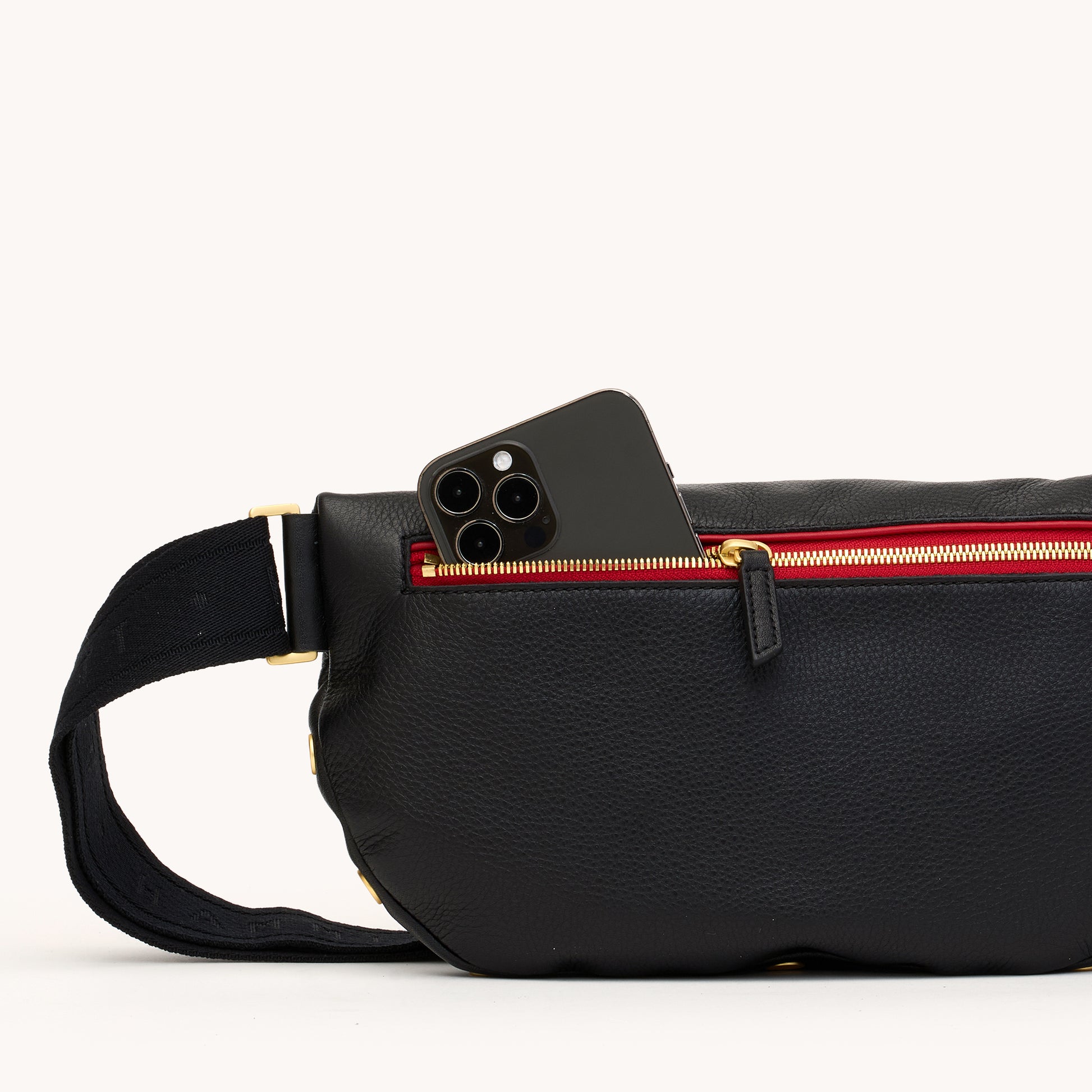 This larger take on one of our most popular bags has all the space you've been dreaming of, with a trendy shape and room for even more essentials. Plus, its long strap allows you to truly wear this style as a low-slung crossbody, in addition to over your chest. Crafted with classic black pebbled leather with our best selling brushed gold hardware and signature red zipper. Our favorite update to the belt bag / fanny pack look, this crossbody bag can be worn as a sling so you can go hands-free.