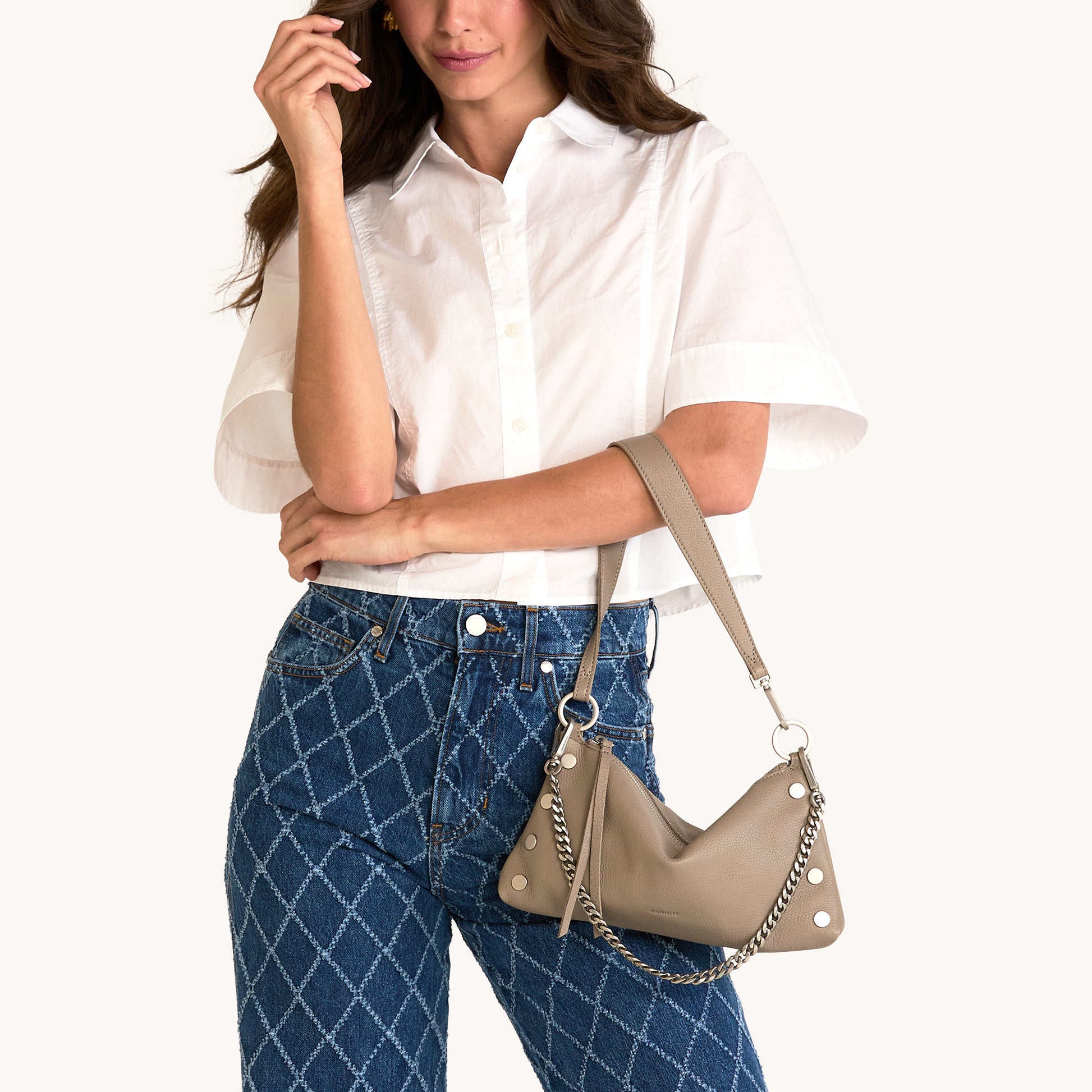This fresh, of-the-moment bag is a must-have companion for nights on the town. Featuring a slouchy but current shape, in our classic pewter leather, this versatile little number transitions from a wristlet to a shoulder bag in seconds flat. The Kyle also includes a removable and adjustable crossbody strap, so you can go hands-free and allows the Kyle to be worn 3 different ways depending on your look!