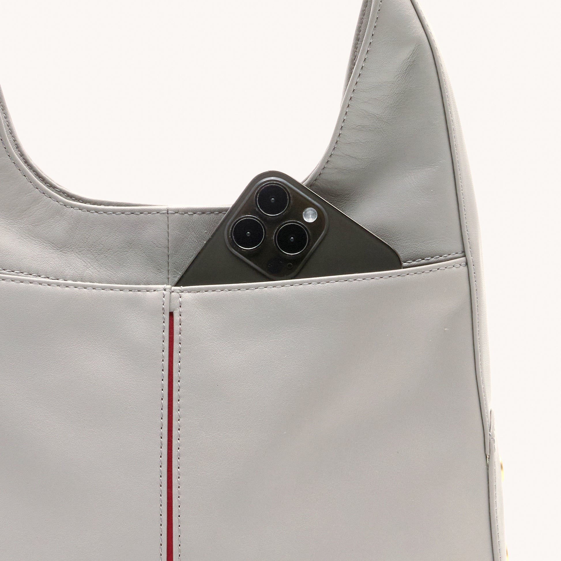 - Crafted with a finished, light grey soft pebble leather with neutral undertones and a hint of shine for a classic look with understated elegance