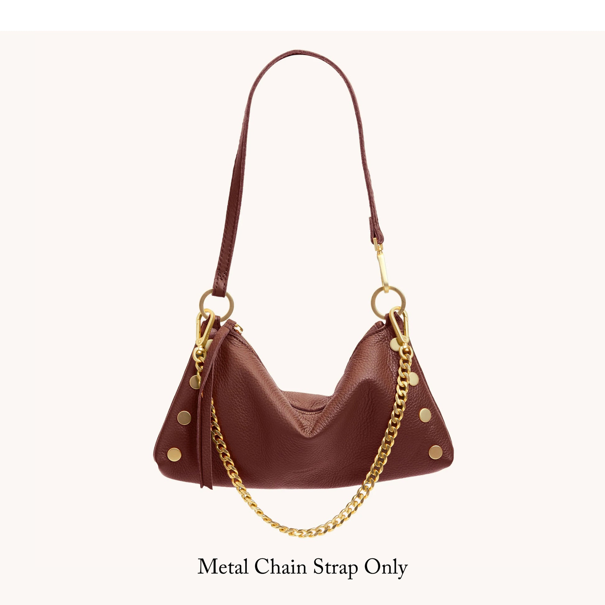 ‘Tis the season for a glittering final touch. Add our limited edition chain strap, available here with our brushed gold jewelry grade hardware, to any bag with a classic removable strap. Chain strap can also be added as a front bag decoration from handle to handle on select bags noted in the details section below!