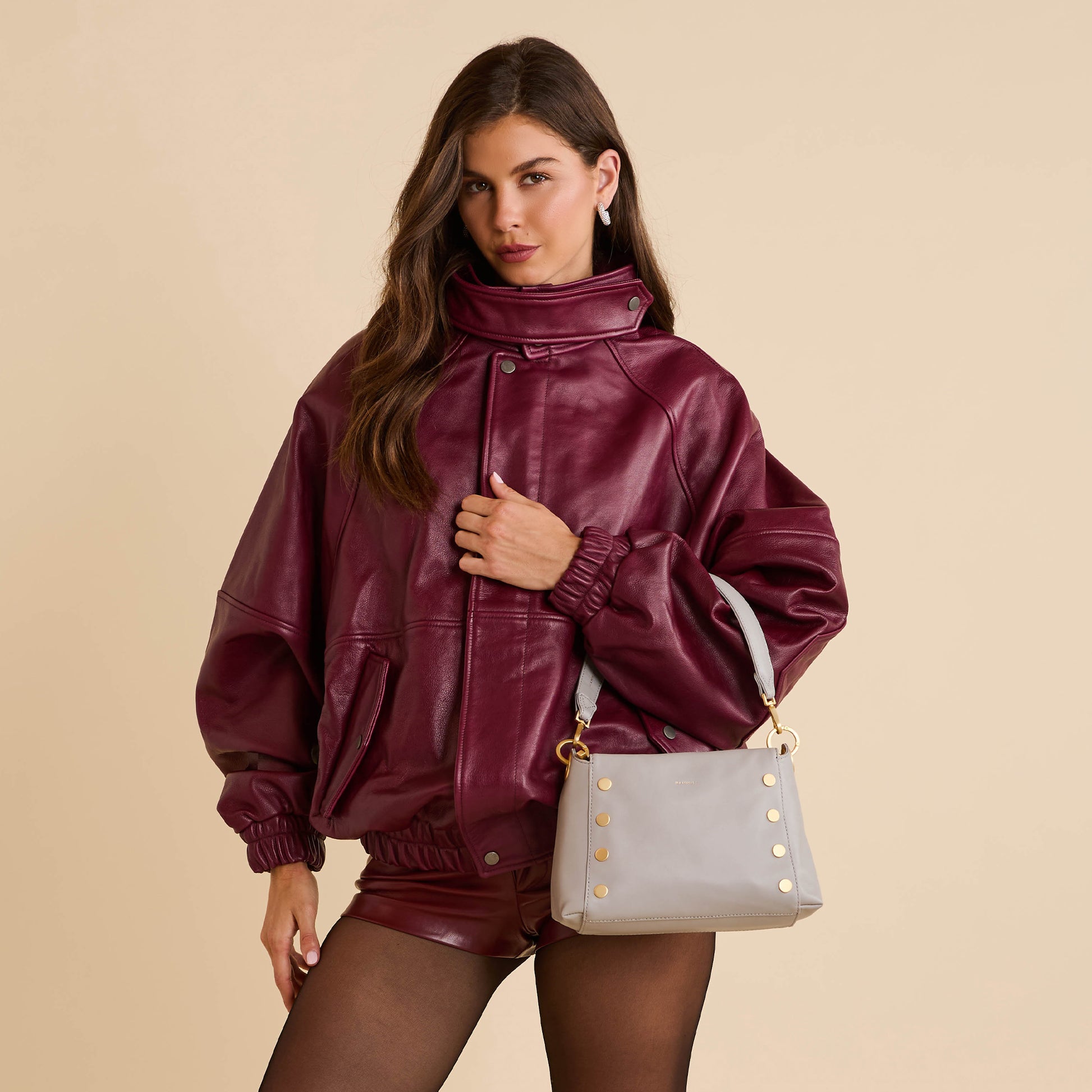 - Crafted with a finished, light grey soft pebble leather with neutral undertones and a hint of shine for a classic look with understated elegance