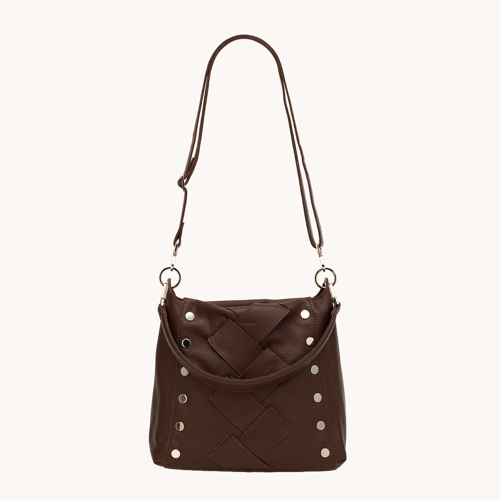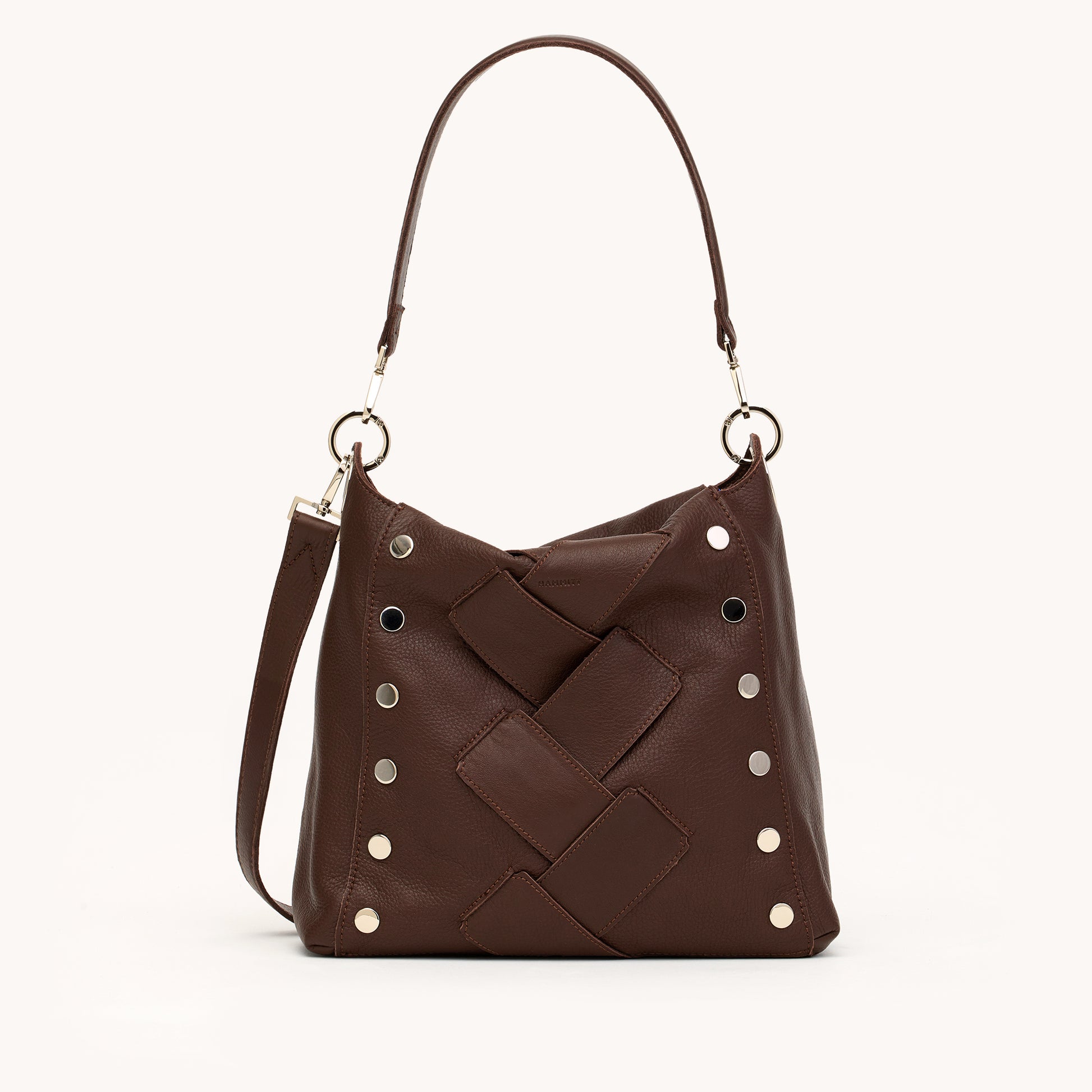 - Crafted with a classic dark espresso brown pebble leather with a large, center weave-like leather pattern