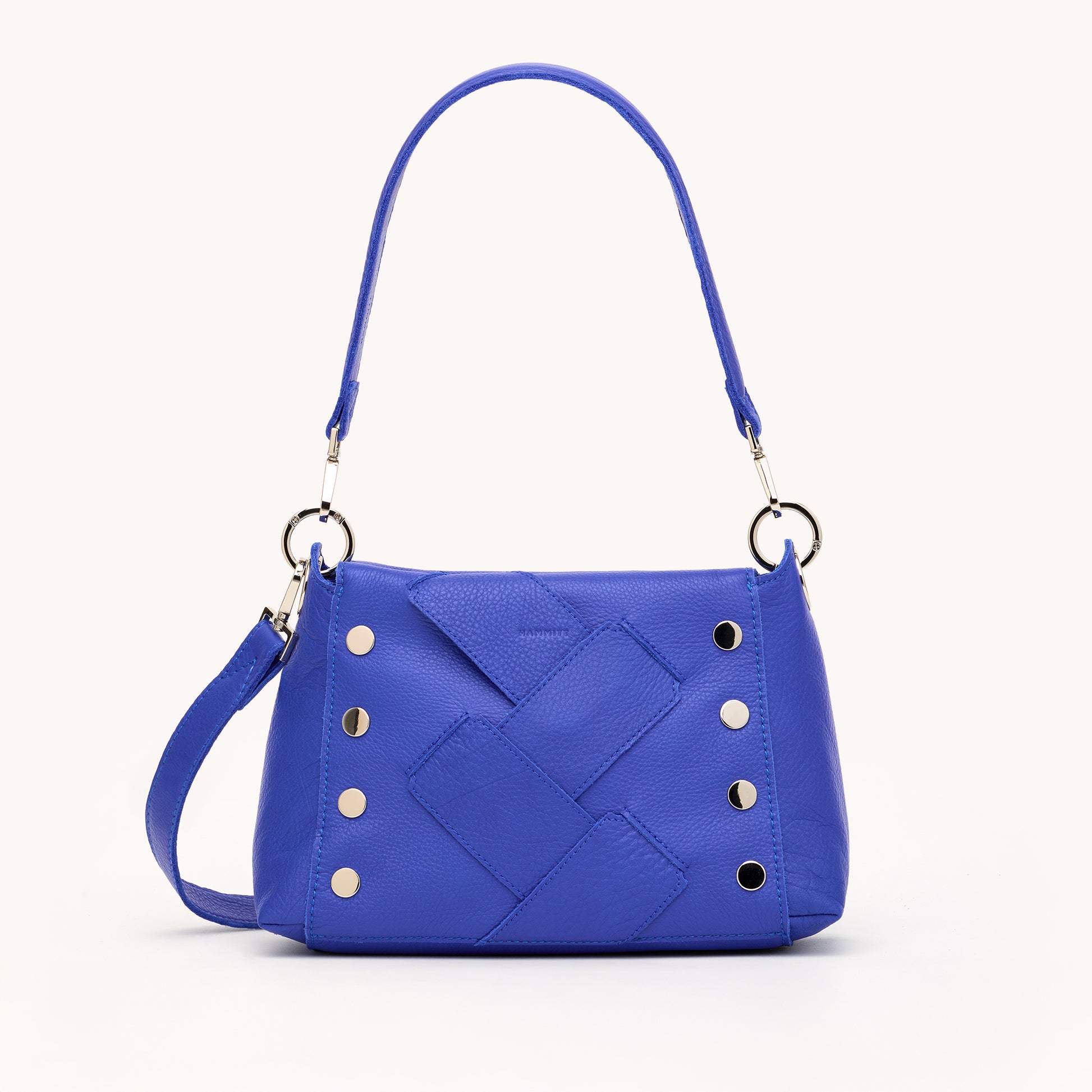- Crafted with a rich, Capri blue pebble leather with a large, center weave-like leather pattern