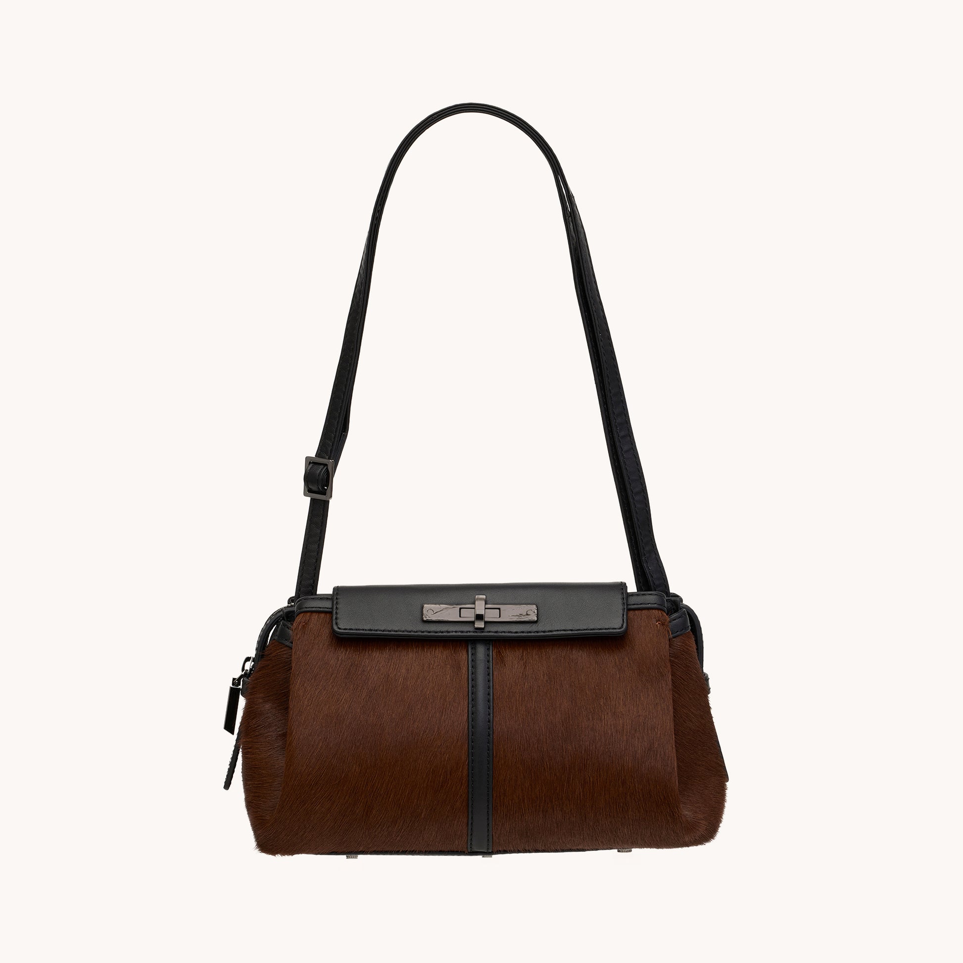 - Crafted with Italian hair on calf hair in deep, rich, chocolate with black smooth, semi-veg tanned and pebble leather accents