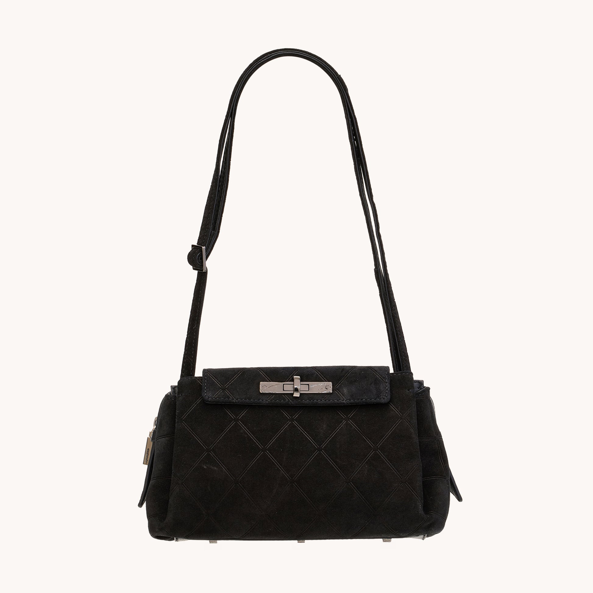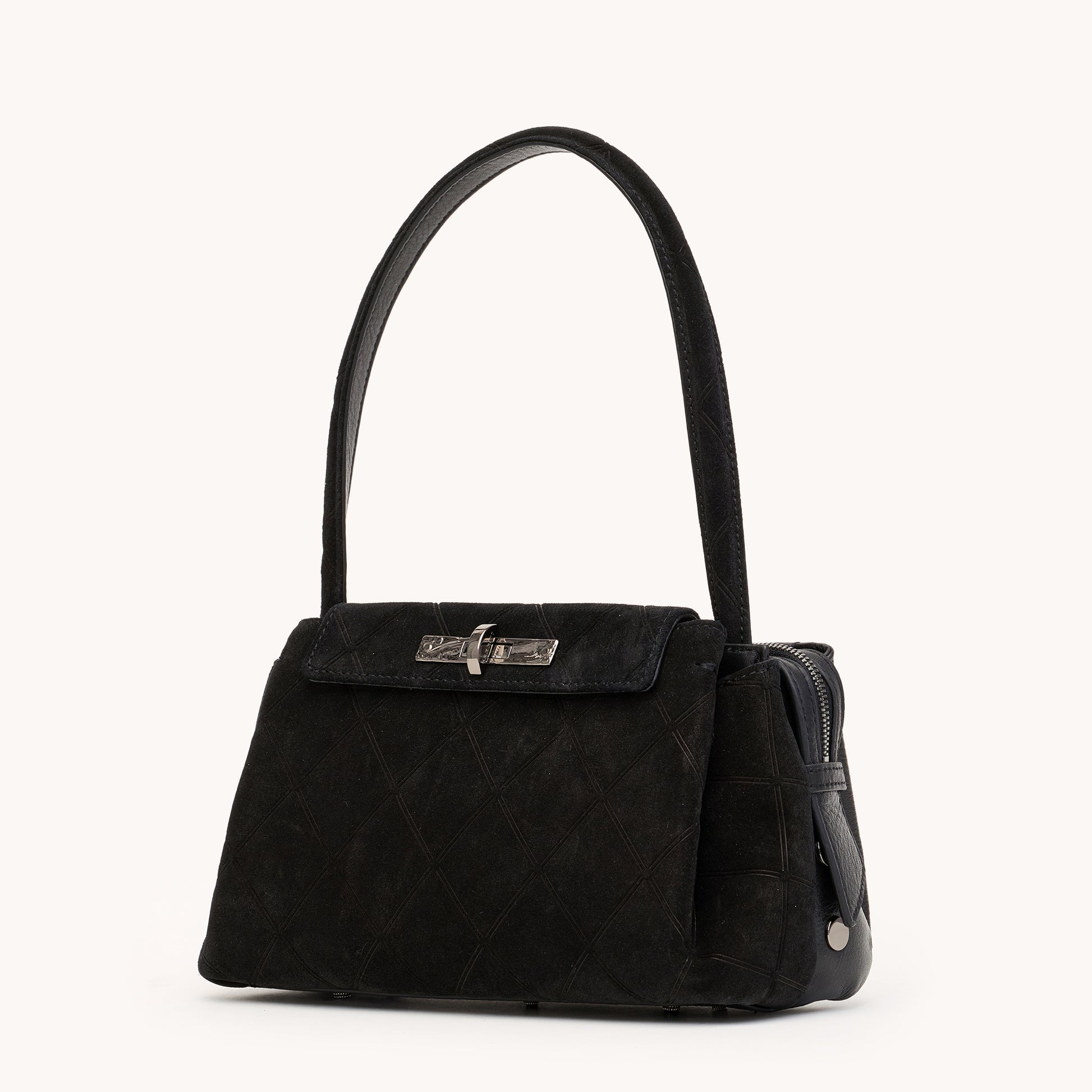 - Crafted with a deep black Italian suede with a unique doubled diamond embossing effect and black pebble leather accents