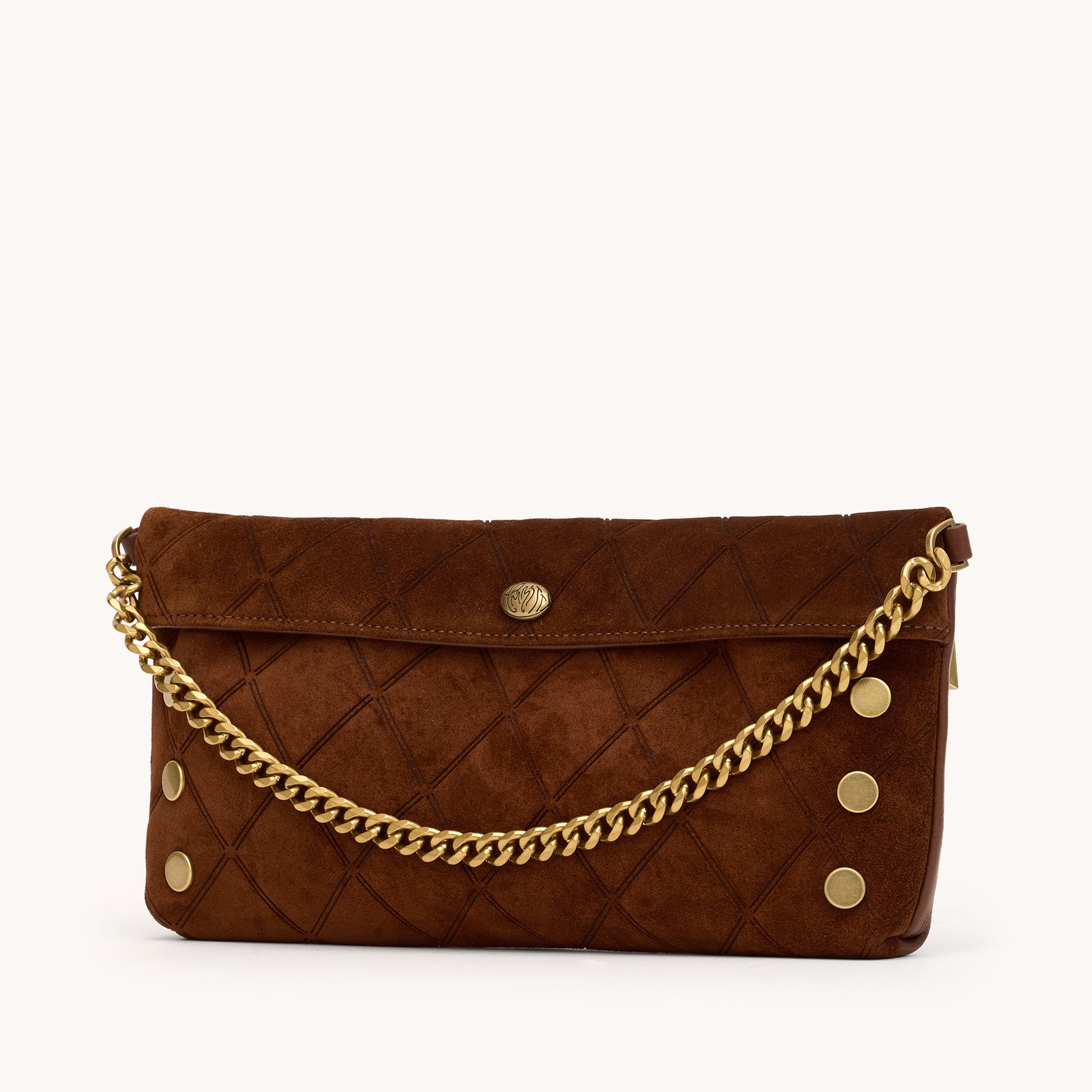 - Crafted with a deep brown Italian suede with a unique doubled diamond embossing effect and deep brown pebble leather accents.