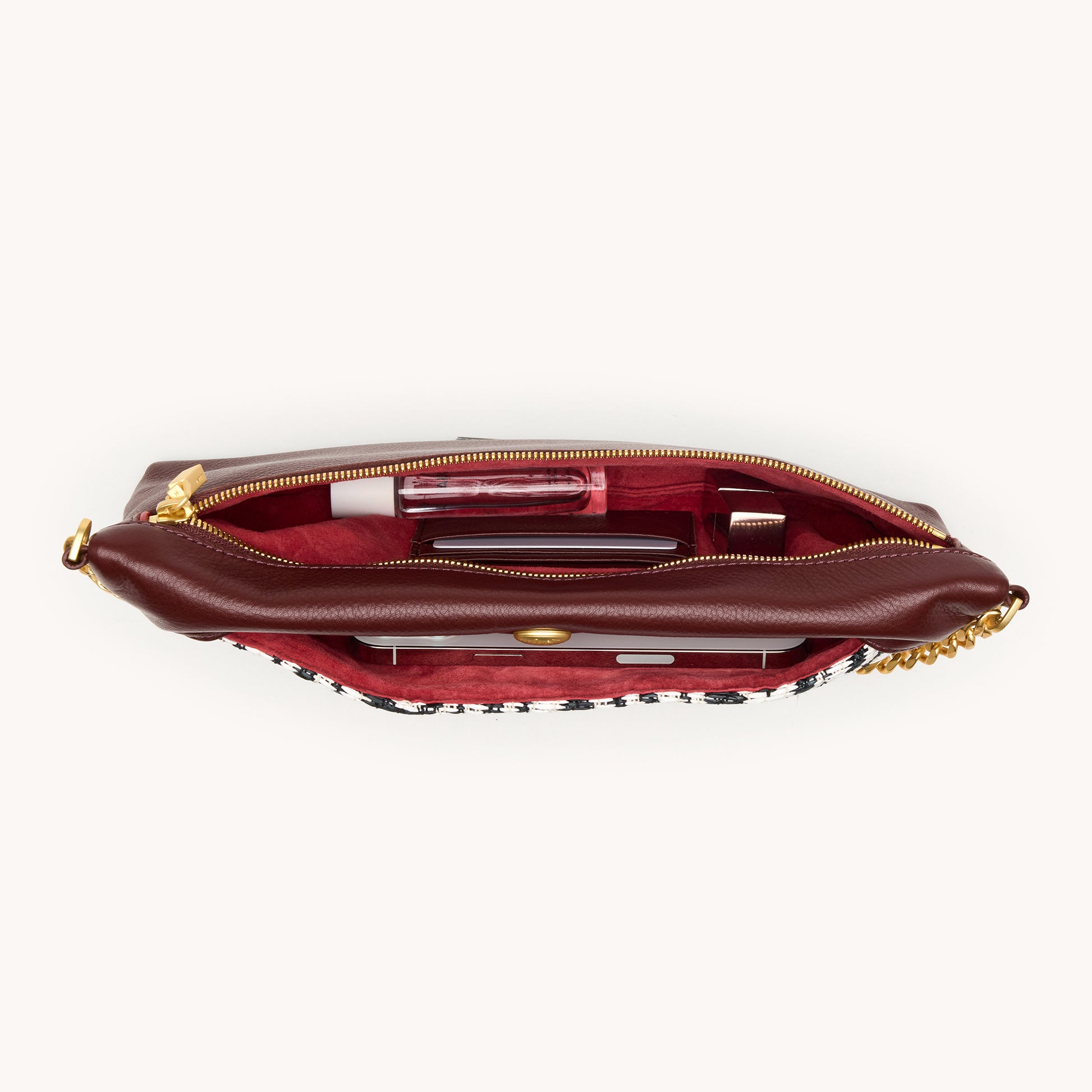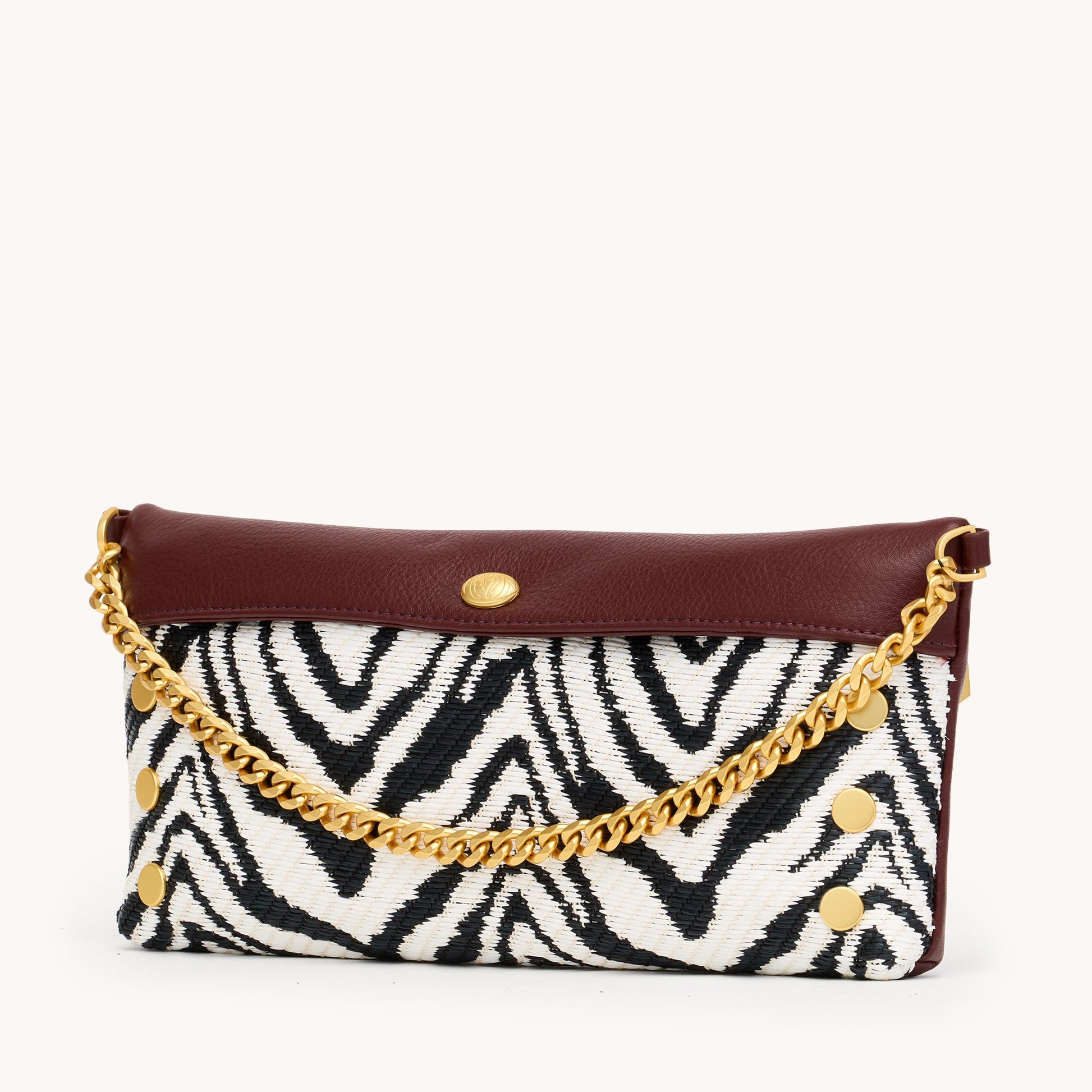- Crafted with a bold, black and white natural raffia with dynamic texture and a deep, oxblood red pebble leather with brown and red undertones