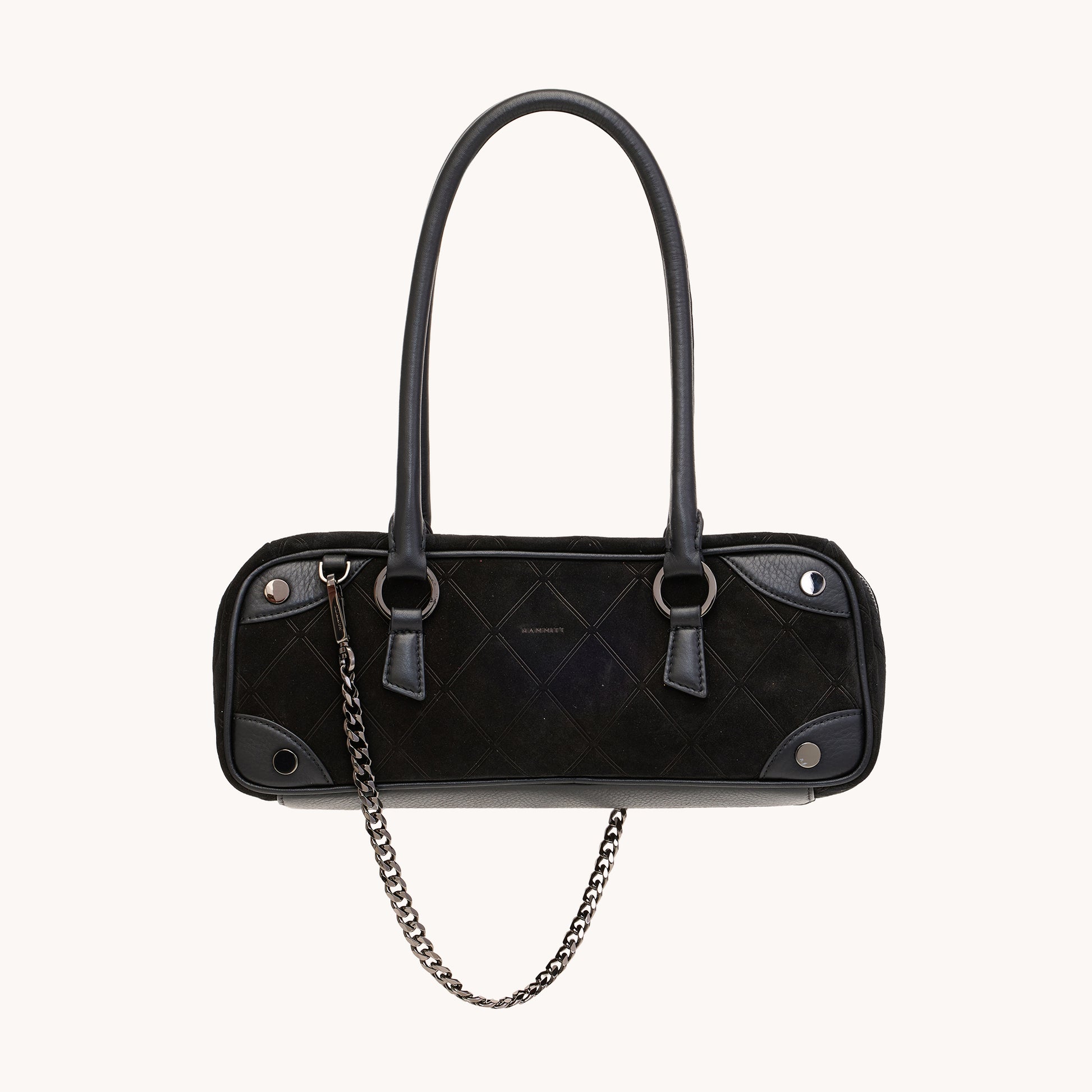 • Crafted with a deep black Italian suede with a unique doubled diamond embossing effect and black pebble leather accents