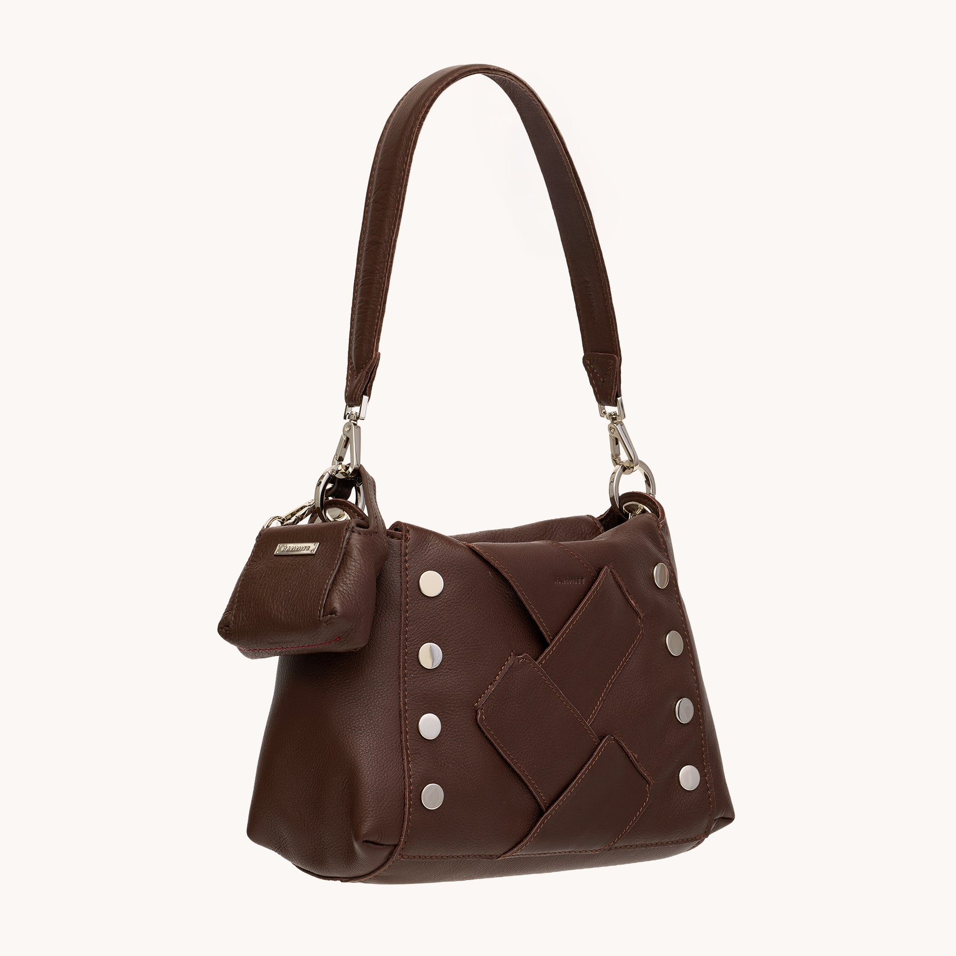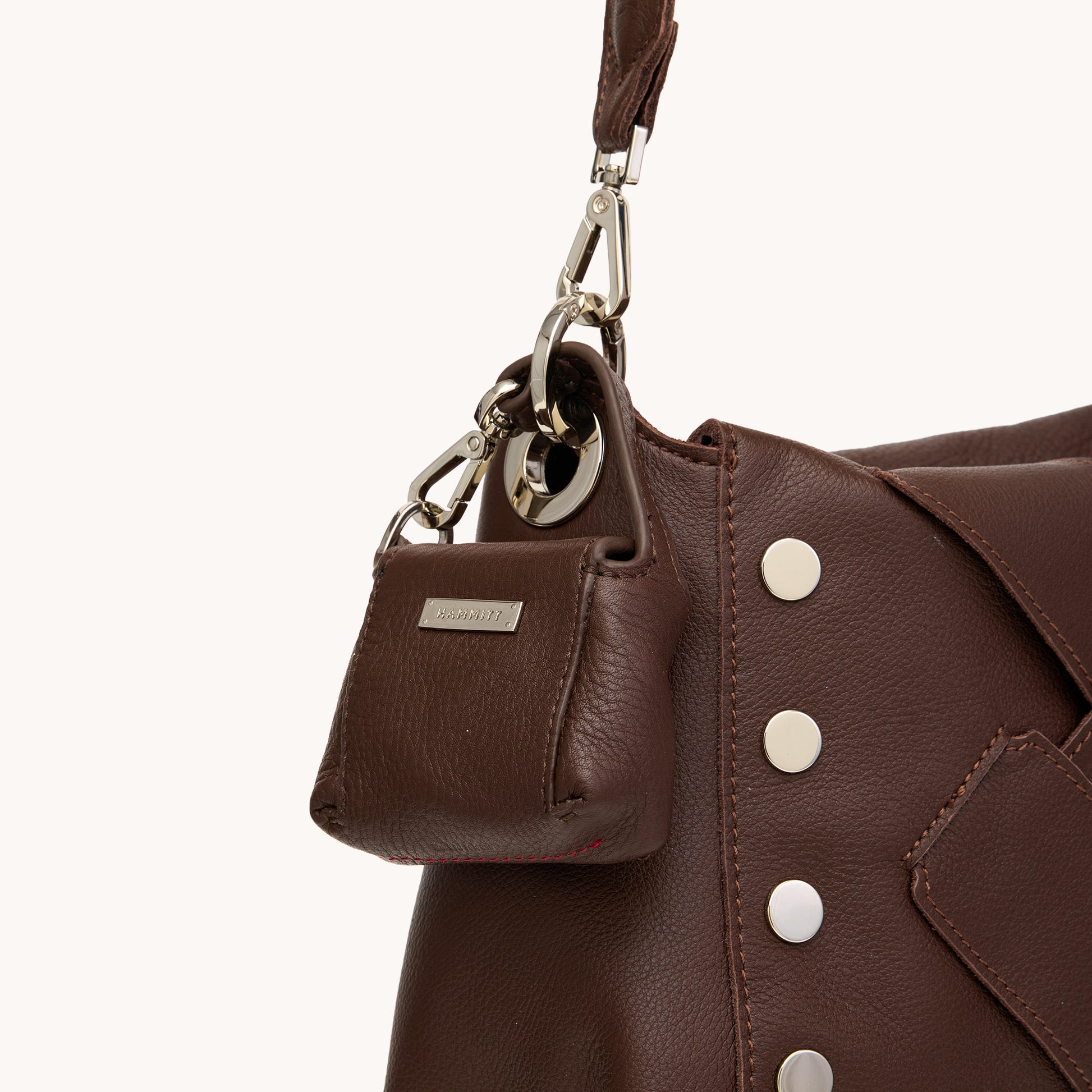 Inspired by our iconic Bryant bags, the Mini B makes the perfect petite dose of Hammitt. Add as a charm to your favorite bag, and tuck little treasures like change or chapstick inside. Pictured here on our Bryant Med bag.