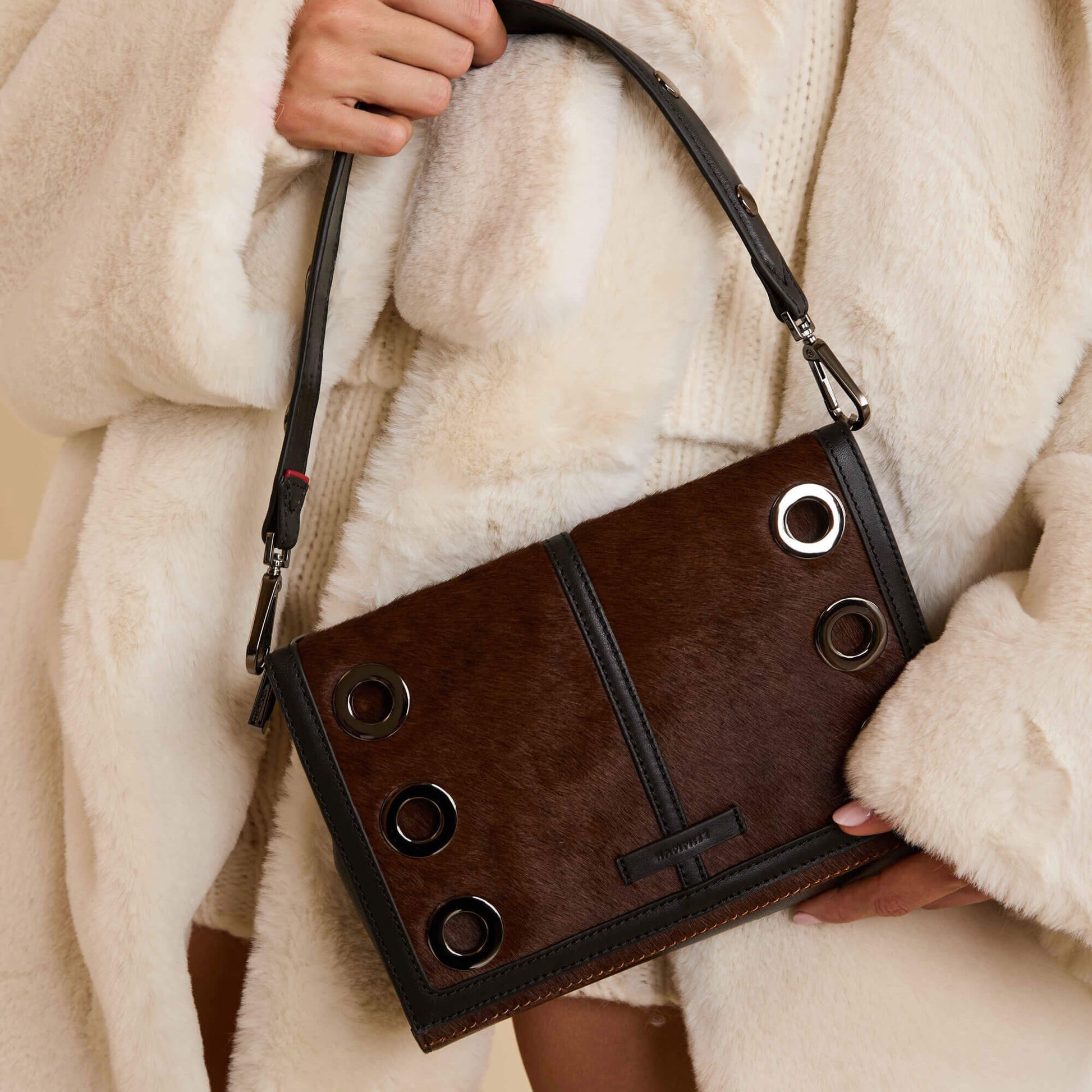 • Crafted with Italian hair on calf hair in deep, rich, chocolate with black smooth, semi-veg tanned and pebble leather accents