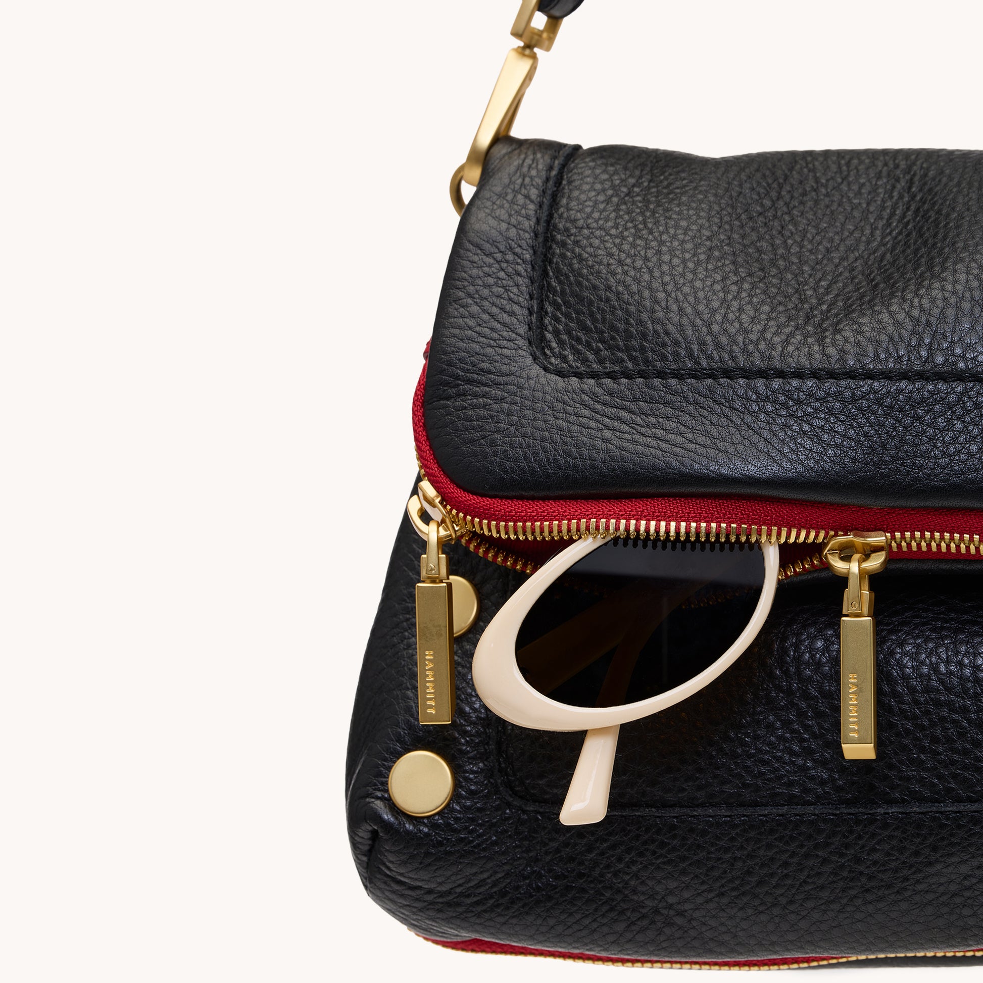 - Detachable riveted short strap and detachable, adjustable 1" crossbody strap